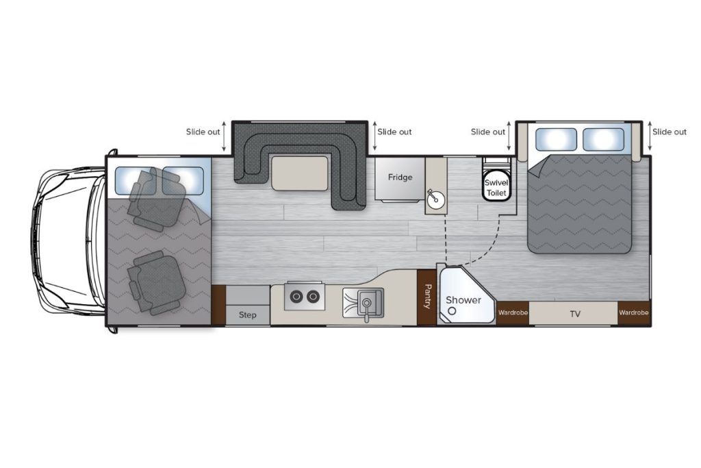 The Avida Fremantle LX motorhome range currently features one floorplan. The model is available in a C class, and has two slide-out rooms.